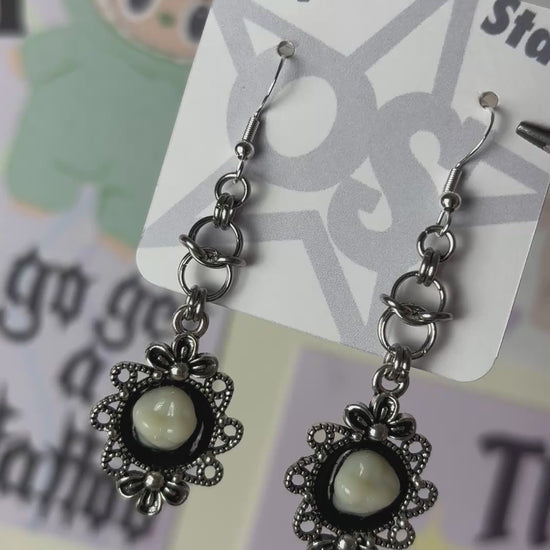 Handmade with fake teeth, Resin and Stainless Steel metals. Sterling Silver 925 Hooks.